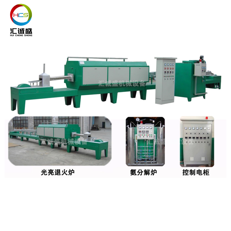 該裝置主要由傳動系統、加熱系統、冷卻系統、控制系統、氨分解供氣系統組成。馬弗爐采用進口耐高溫鎳合金壓焊而成;可拆裝的電熱元件可上下加熱;鋼帶輸送無級調速;液氨分解得到的氣體混合物(氫75%、氧25%)進入爐缸,達到氣體保護效果;氣體方向調節裝置,保證大氣穩定。經過這種爐處理后,產品表面會變得光亮,不會被氧化。所有經過處理的產品將達到良好的一致性。